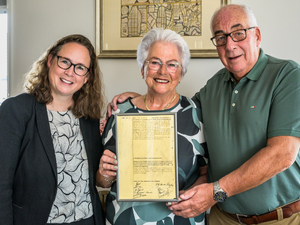 Het echtpaar Saelman viert hun diamanten huwelijk, en namens al onze inwoners ging burgemeester Michel langs om hen in het zonnetje te zetten. Samen met hun familie zitten ze er klaar voor en vertellen ze hoe ze elkaar hebben leren kennen op een dansschool in Amsterdam. |