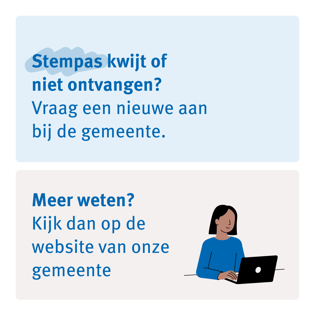 Heb je de stempas niet ontvangen of ben je hem kwijt? Vraag dan een nieuwe aan via de link hieronder of kom (zonder afspraak) naar het gemeentekantoor. Dit kan tot uiterlijk woensdag 15 oktober. |