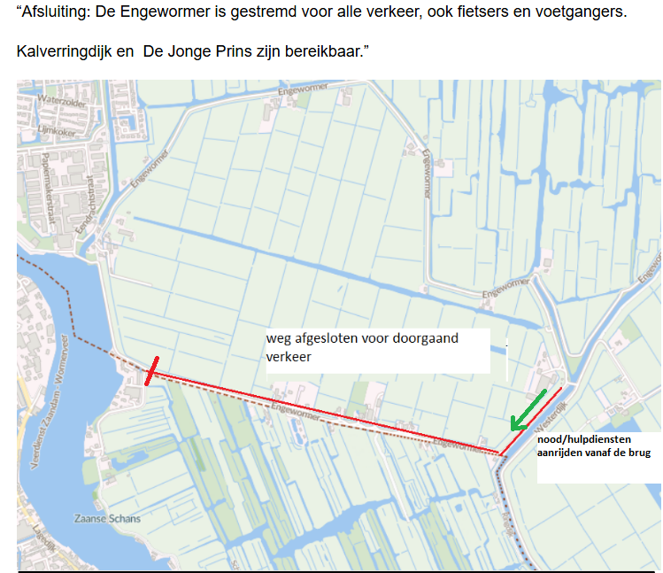 Van 20 oktober t/m 19 december is de Engewormer gestremd voor al het verkeer, ook fietsers en voetgangers. De adressen langs de rode lijn zijn vanaf de brugzijde bereikbaar. De Kalverringdijk en De Jonge Prins zijn bereikbaar. |