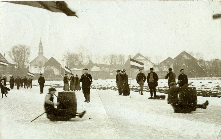 IJspret in Oost-Knollendam. Beeld 1907. Priksleewedstrijden op een bevroren sloot. De NH kerk en Pastorie op de achtergrond.