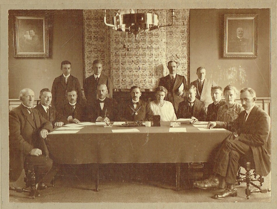 De gemeenteraad van Wormer in 1919 bijeen bij de installatie van burgemeester Pieter Kooiman. Tweede van rechts het eerste gekozen vrouwelijke raadslid, mevrouw Schoute-Leeuwerink van de SDAP.