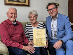 Locoburgemeester Rick Ossendorp feliciteerde het echtpaar Floore-van der Hoorn met hun diamanten huwelijk: 60 jaar samen! Ze wonen nu met plezier in hun seniorenwoning, na vele jaren aan de Dorpsstraat gewoond te hebben. Daar hadden ze achter het huis een prachtige, idyllische tuin waar ze enorm van hebben genoten. In april gaan ze het groots vieren met familie en vrienden. Namens Wormerland: van harte gefeliciteerd en nog vele gelukkige jaren samen! |