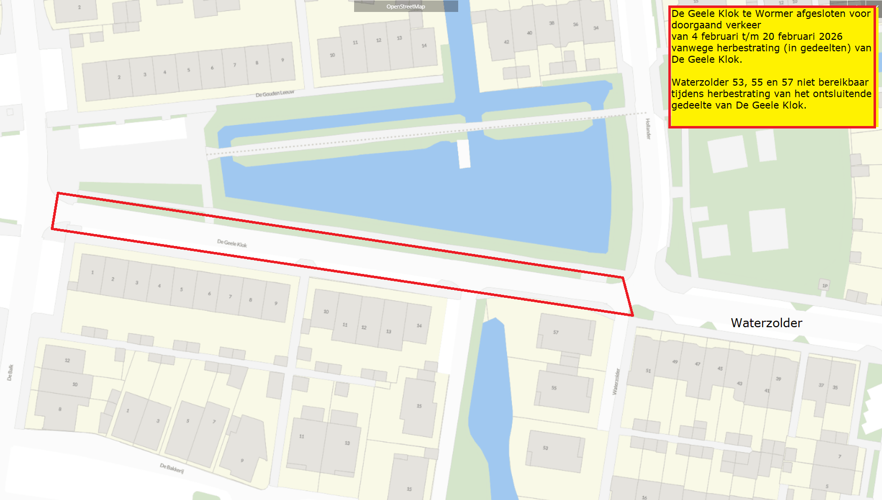 In verband met het herbestratingswerkzaamheden (in gedeelten) is De Geele Klok afgesloten voor doorgaand verkeer vanaf woensdag 4 februari. Waterzolder 53, 55 en 57 zijn niet bereikbaar tijdens herbestrating van het ontsluitende weggedeelte van De Geele Klok. De planning is dat de werkzaamheden (ijs en weder dienende) duren tot en met vrijdag 20 februari. |