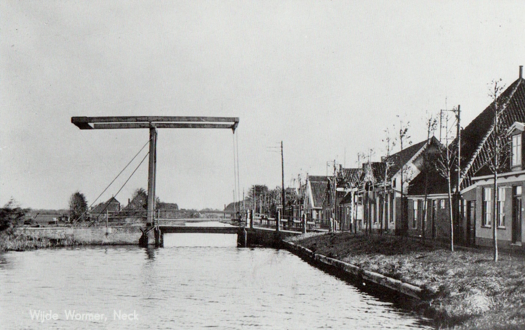 Fraaie ansichtkaart van oud Neck in 1949. Veel is er al veranderd. Het stolpboerderijtje en het grote statige huis links daarvan zijn nu verdwenen. De Neckerbrug die in 1927 voor een bedrag van f 5000,— is gebouwd door de firma Wittebrood uit Purmerend, heeft het ongeveer 40 jaar uitgehouden en is toen vervangen door een nieuwe brug, die schuin over de ringsloot werd gelegd. Daardoor kan het verkeer nu beter de bocht maken.