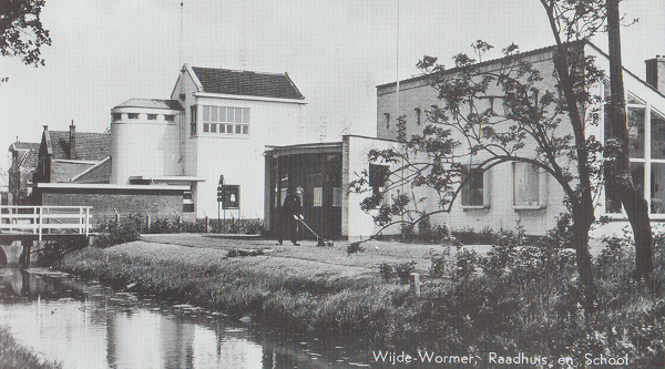 Het gemeentehuis van Wijdewormer werd in de jaren ’50 gebouwd en in 1957 officieel geopend door de commissaris van de koningin in Noord-Holland. Naast het gebouw stond lang de oude lagere school. Die school is later gesloopt, waarna er op een andere plek een nieuwe school kwam. Vanaf 1991 gebruikte Nico Poel het pand als assurantiekantoor. De sloot langs het gebouw is daarna gedempt. Foto: Stichting Behoud Cultuurhistorie Wijdewormer |